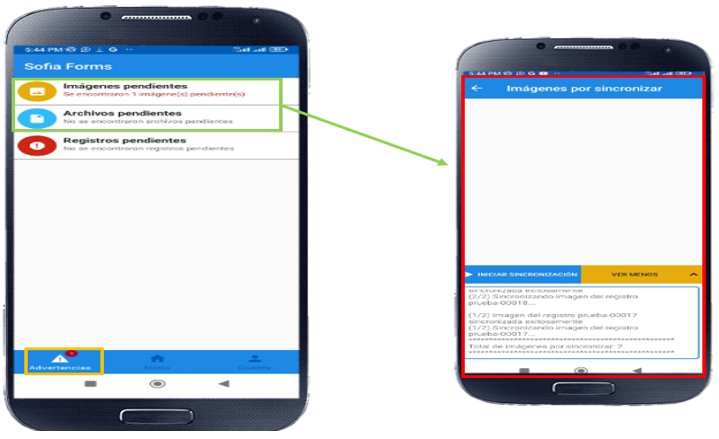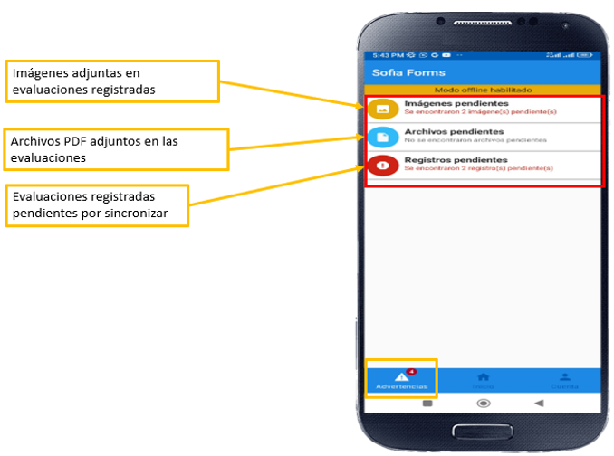 Cuando se ha trabajado en modo offline las evaluaciones creaciones se encontrarán pendientes por sincronizar dentro de la sección advertencias, junto a las imágenes y archivos que se han adjuntado.