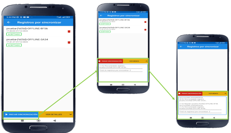 En una zona con una conexión estable a Internet ir a la sección de Advertencias, donde aparecerá alertas, dar clic en Registros pendientes, se visualizarán todas las evaluaciones que se han registrado en modo offline y que se encuentran pendientes por sincronizar, dar clic en Iniciar Sincronización y esperar hasta que ningún registro aparezca en la lista de Registros por sincronizar.