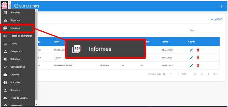 Sofia Forms te permite crear tus informes personalizados. Para ello te permite subir formatos Excel o Word. Para visualizar y configurar los informes, ir a la opción de administrador y seleccionar la opción “Informes”.