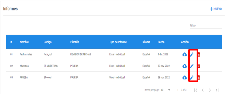 Modificar Informes Dar clic en el icono de lápiz al costado del informe que se desea modificar. Modificar y hacer clic en “Aceptar” Navegación de documentos← Descarga de InformesEliminar Informe → ¿Te ha resultado útil este artículo? No Sí ¿Cómo podemos ayudarte? Nombre Correo eletrónico Asunto Mensaje