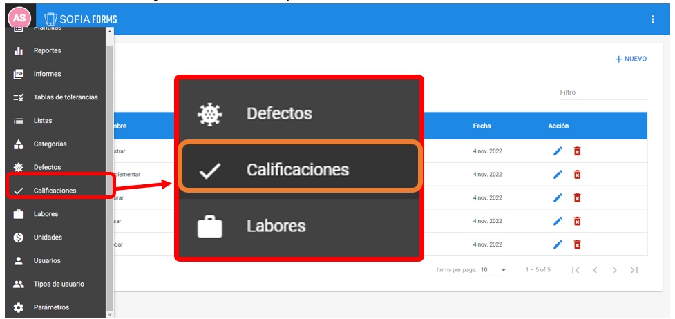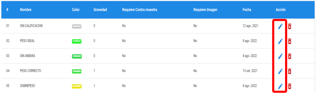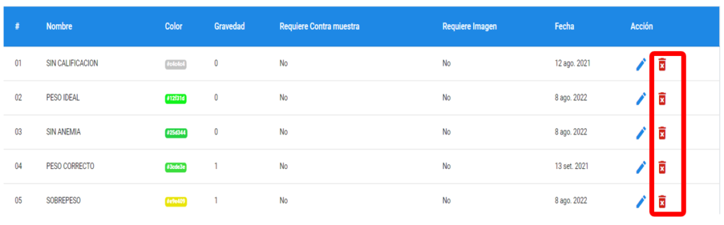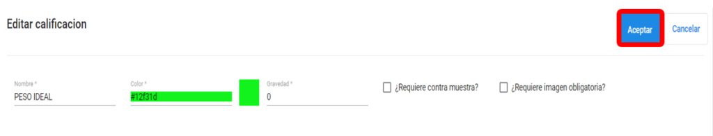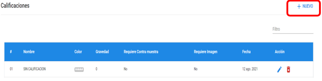 NOTA: Por defecto el sistema contará con una calificación por defecto llamada SIN CALIFICACIÓN, que se asignará a las evaluaciones que no cuenten con una tabla de tolerancia, por ello se recomienda eliminar o renombrar dicha calificación.