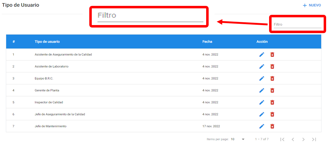 Se visualizan todos los tipos de usuario existentes; donde además se tendrá la opción de filtrar.