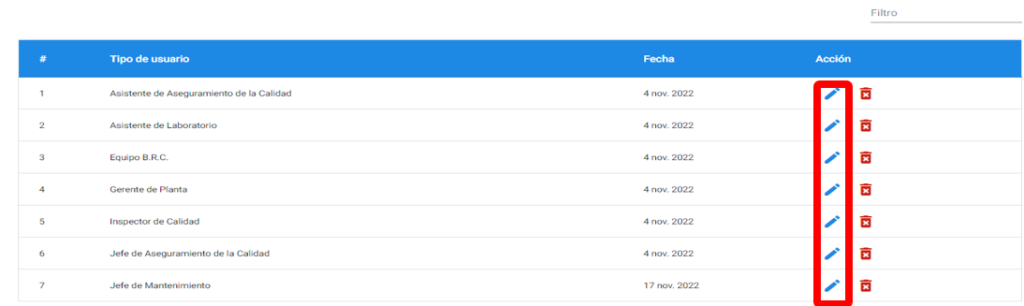 Para MODIFICAR un Tipo de Usuario dar clic en el icono de lápiz al costado del tipo de usuario que se desee modificar