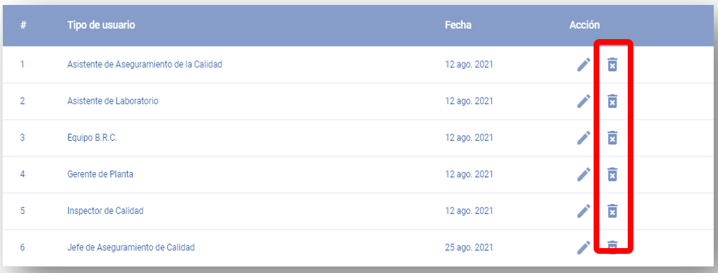 Para eliminar alguno de los tipos de usuario, dar clic en el icono de papelera al costado del tipo de usuario que desee eliminar.