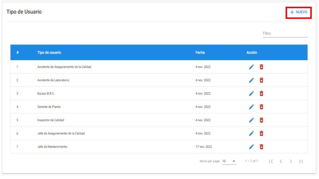 Para CREAR un Tipo de Usuario dar clic en la opción «NUEVO».