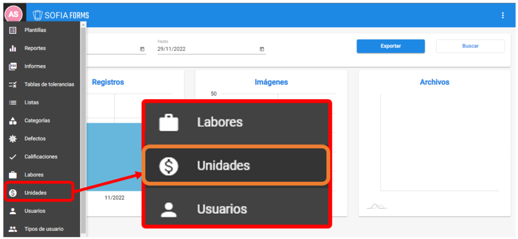 Para visualizar y configurar las unidades, ir a la opción de administrador y seleccionar la opción “Unidades”