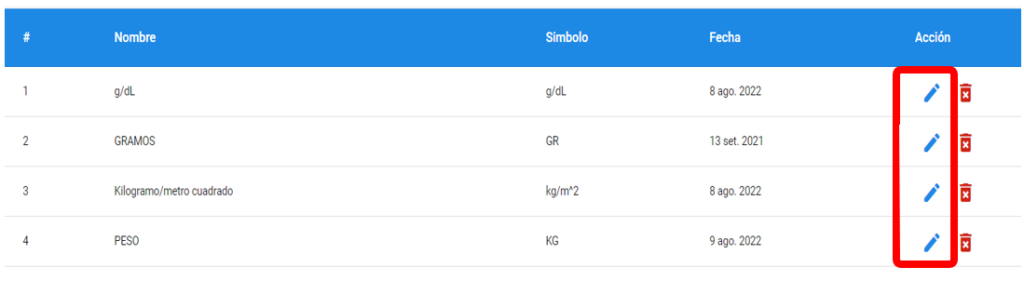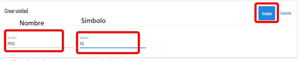 Dar clic en el icono de lápiz al costado de la unidad que se desea modificar. Modificar y hacer clic en “Aceptar”