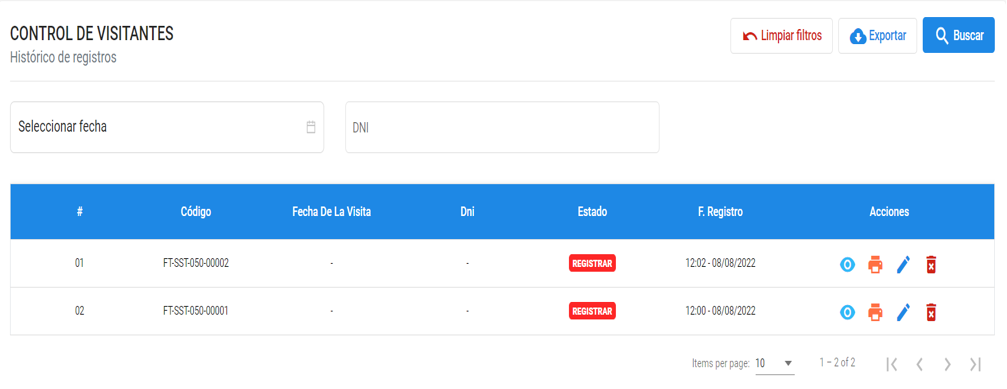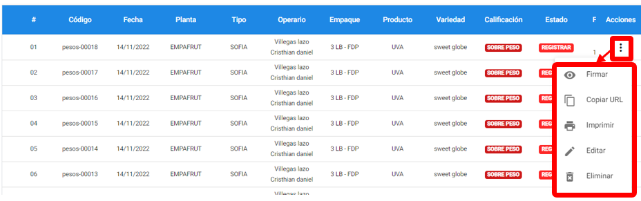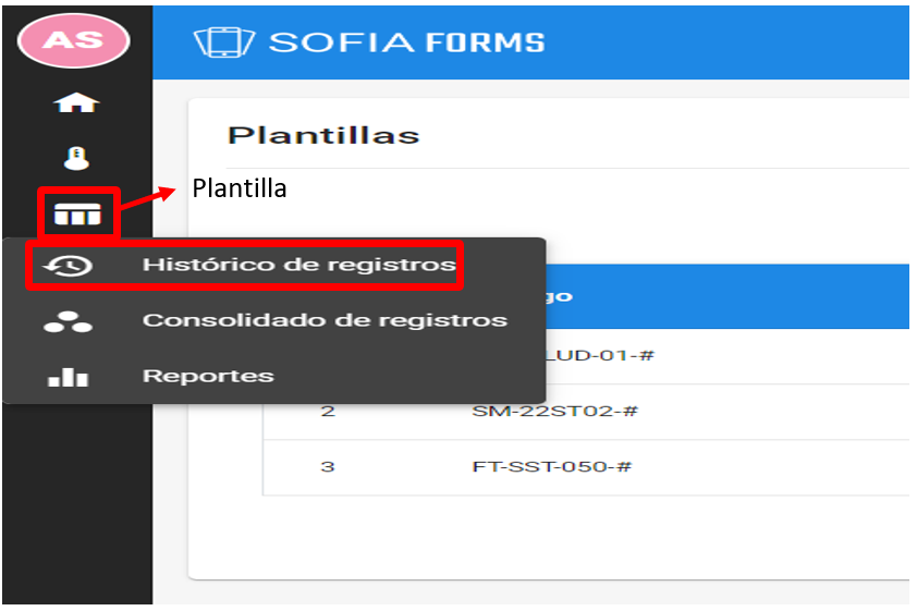 Las plantillas aparecerán en el menú izquierdo del sistema. Hacer clic sobre el icono de la plantilla, y seleccionar la opción “Histórico de registros”