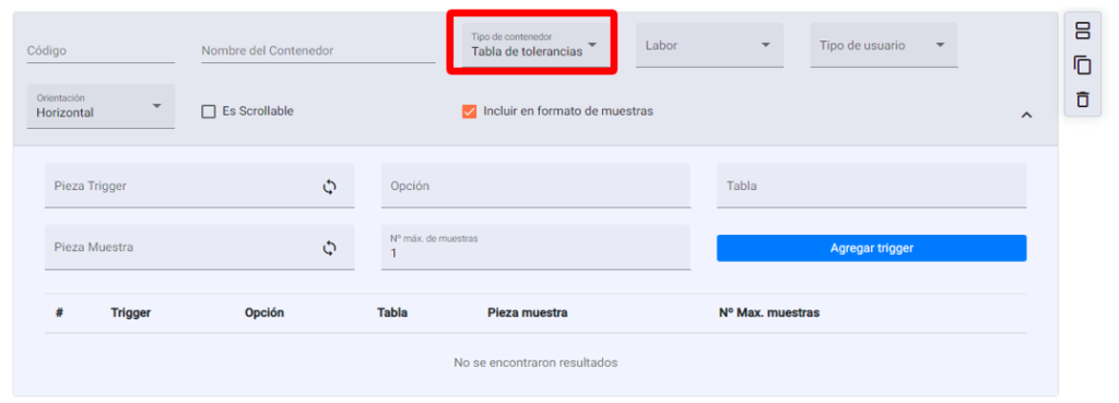 Tablas de Tolerancia: Se seleccionará si se desea hacer una sección en la que se realicé algún tipo de operación de acuerdo a las tablas de tolerancia. Se ingresarán los datos básicos del contenedor además de datos referentes a la tabla para agregar triggers. Los triggers son unos parámetros opcionales, que son acciones que se realizarán con determinados datos que permiten seleccionar una tabla de tolerancias diferente según la opción seleccionada de una lista presente en la plantilla.