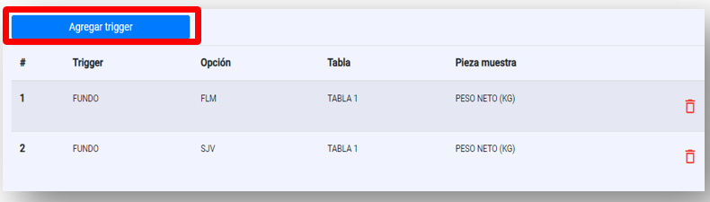 Agregar trigger: Hacer clic en el botón, se irán agregando en la tabla que se encuentra en la parte inferior.