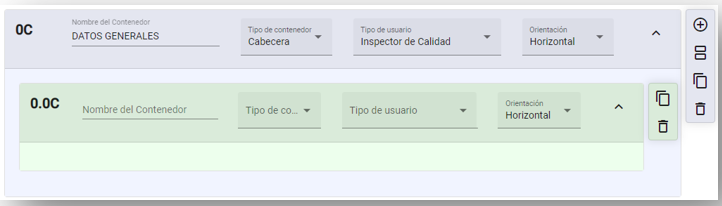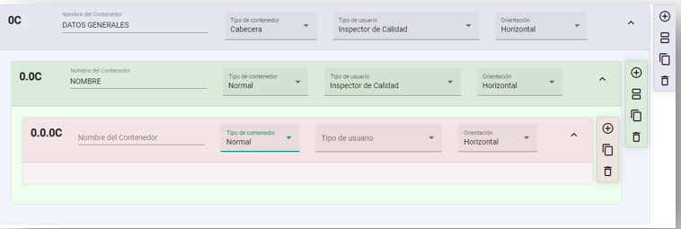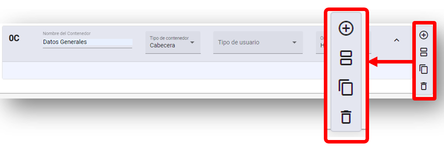 Al seleccionar el tipo de sub contenedor, mostrará más opciones. Para agregar piezas, agregar sub contenedores, copiar contenedor y eliminar contenedor.