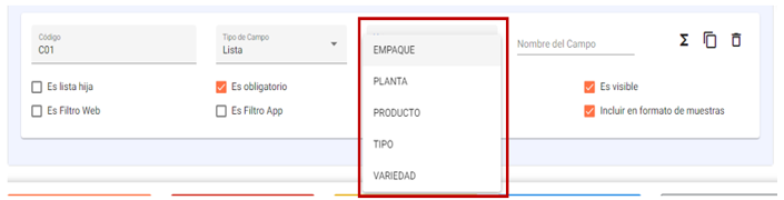 - Es lista hija: Aparece al seleccionar el tipo de campo Lista.Marcar si su lista depende de una lista padre, asimismo al seleccionar la opción de la lista padre se filtrarán las opciones de acuerdo a la opción elegida.
