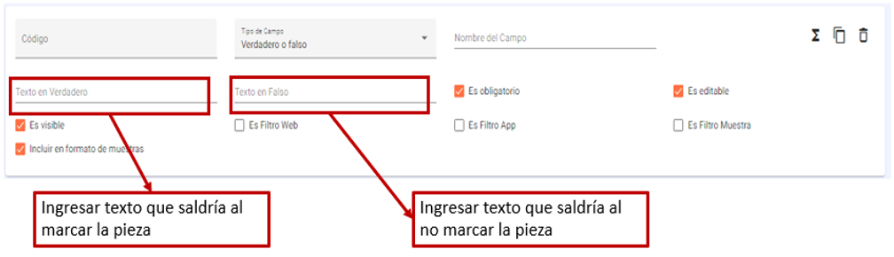 - Verdadero o falso: Aparecerá como un checklist. Si la pieza se encuentra marcada se insertará automáticamente el texto en Verdadero, caso contrario, el Texto en Falso.