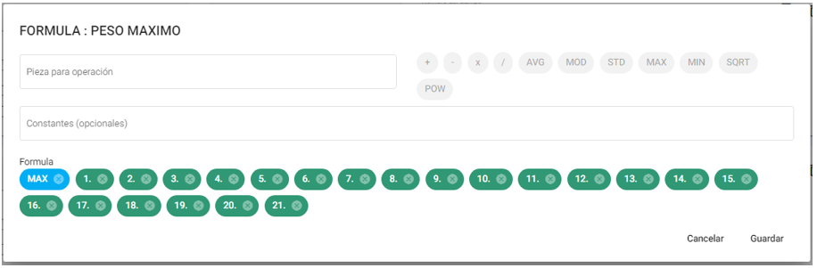 - MAX: Seleccionar para calcular el máximo de un determinado número de piezas.