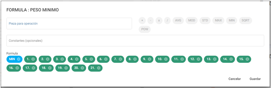 - MIN: Seleccionar para calcular el mínimo de un determinado número de piezas.