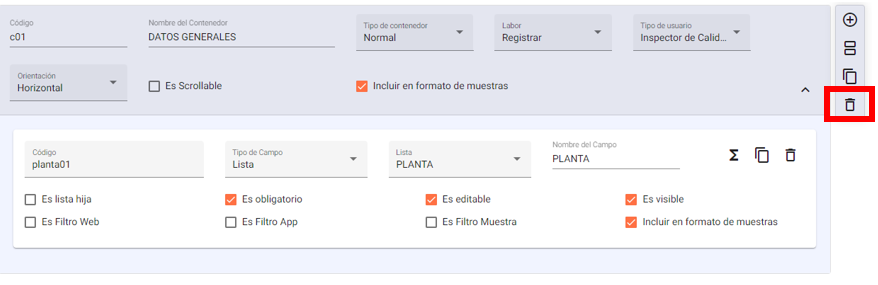 Hacer clic en el icono de eliminar. El contenedor se elimina automáticamente