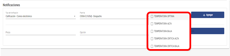 Asimismo, al seleccionar el tipo de notificación y la plantilla se desplegará el campo Pieza y Opción, aquí podrás agregar para que de acuerdo a una pieza Lista de la evaluación se pueda filtrar las notificaciones que llegarían para el usuario. Se agregará en la parte inferior. Se puede agregar varias notificaciones