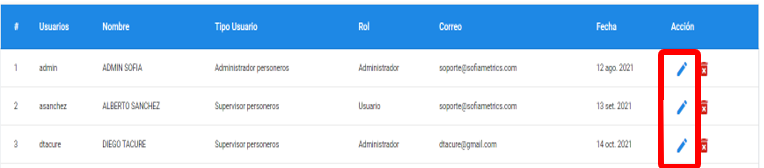 Dar clic en icono de lápiz al costado del usuario que se desea modificar. Modificar y hacer clic en “Aceptar”.