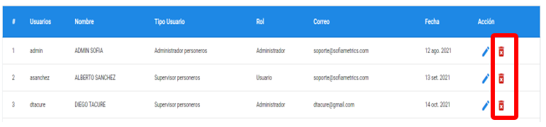 Dar clic en el icono de papelera al costado del usuario que se desea eliminar.